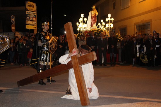 Este auto continua en la calle con Jesús saliendo de la iglesia ya azotado, camino del Calvario, junto a él, los tronos de Santiago Apóstol y María Magdalena que finalmente confluyen en el encuentro de las calles Belchite, Cervantes y Maestro Falla ante el silencio del público roto por la sentidas saetas.