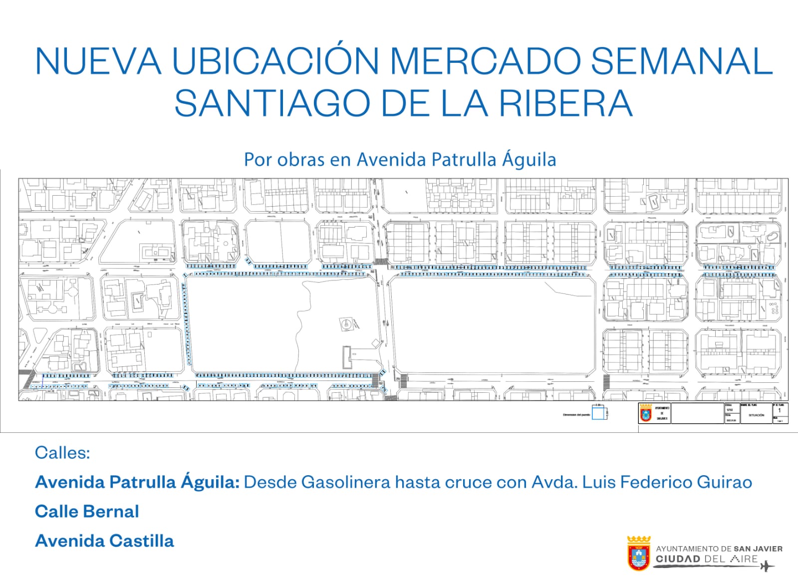 El inminente comienzo de las obras en la Avenida de la Patrulla Águila han obligado a cambiar temporalmente la ubicación del mercado semanal de los miércoles en Santiago de la Ribera que habitualmente se extendía por toda la avenida próximamente en obras. La ubicación actual cambia repartiendo los puestos entre el comienzo de la Avenida Patrulla Águila hasta el cruce con la Avenida Federico Guirao. Una parte de la calle Bernal y un tramo de la avenida Castilla.