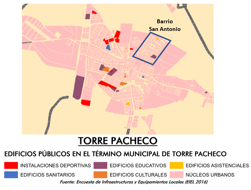 “El barrio de San Antonio, es una de las zonas diana, en las que la estrategia DUSI, quiere focalizar sus esfuerzos de mejora y rehabilitación de espacios. Desde el estudio realizado previo al diseño de la estrategia DUSI “TORRE PACHECO TIERRA DE CONTRASTE”, se identifica a este barrio, compuesto de varios núcleos urbanos, como uno de los que más inversiones públicas necesita para la vertebración del barrio, al objeto de mejorar la calidad de vida de sus vecinos/as”, ha manifestado Carlos López Martínez, Concejal de Hacienda y Proyectos Europeos.