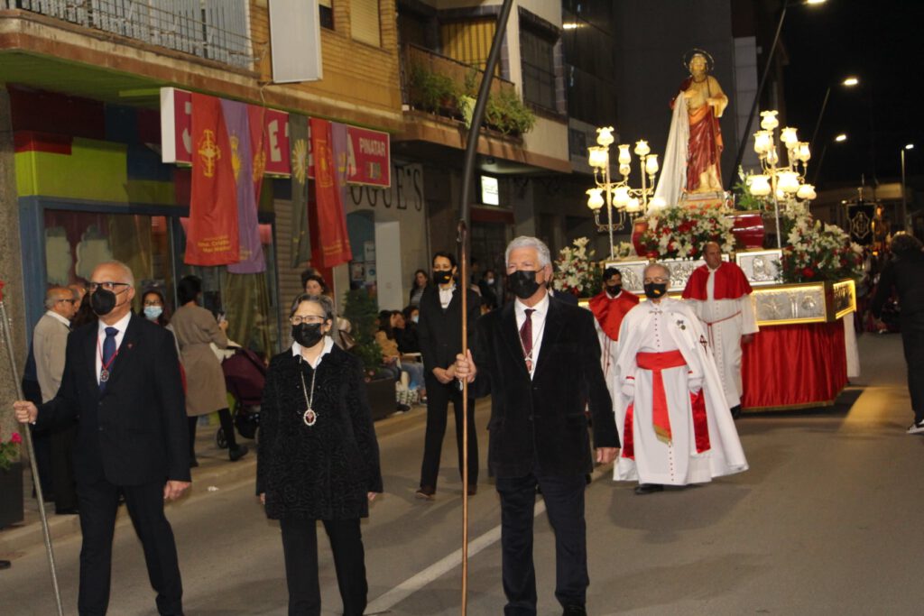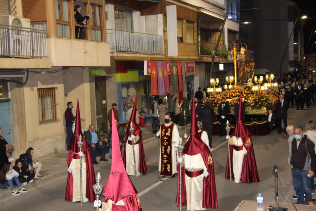 Los tronos de San Juan Evangelista y la Virgen de Los Dolores, una imagen del escultor Sánchez Lozano que procesiona bajo palio, seguidos de los párrocos de la localidad y la comitiva oficial, presidida por el presidente del Cabildo, Mariano Visedo y la alcaldesa, Visitación Martínez, cerraban la procesión junto a la banda Unión Musical.