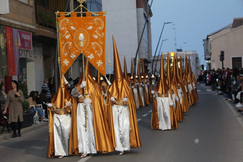 El estandarte del Cabildo Superior de Hermandades y Cofradías abría el cortejo en el que se representan diferentes escenas de la pasión de Jesucristo, seguido por el Santo Grial, la Oración en el Huerto, Jesús de Medinaceli, portado a hombros por mujeres, los apóstoles Santiago y San Pedro y el trono de la Piadosa Verónica.
