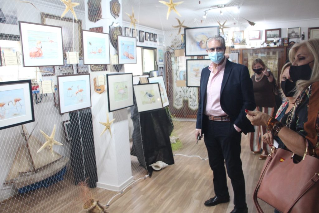 Guillermina, presidenta de la Asociación de Pintores de Murcia (Apimur), muestra más de una veintena de obras, en su mayoría acuarelas con inspiración marinera. Así, flamencos, garzas, tortugas marinas y caballitos de mar se mezclan con azules oceánicos y cálidos atardeceres, recuerdos de una vida unida ligada al mar desde la infancia.