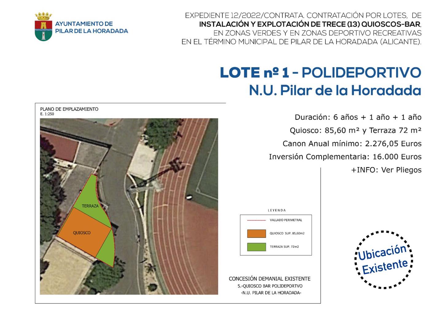 Pilar de la Horadada licita la explotación de 13 quioscos-bar en zonas verdes y deportivo-recreativas de Mil Palmeras (uno), Torre de la Horadada (8) y centro urbano (4). De las 13 localizaciones, siete de ellas son de nueva creación porque se ubican en lugares donde antes no había estos establecimientos y los seis restantes han terminado el periodo concesional, por lo que salen a licitación para un nuevo periodo. Las empresas que quieran optar al concurso deberán presentar sus ofertas antes del día 30. El contrato, que se divide por lotes, asciende a 673.511 euros.
