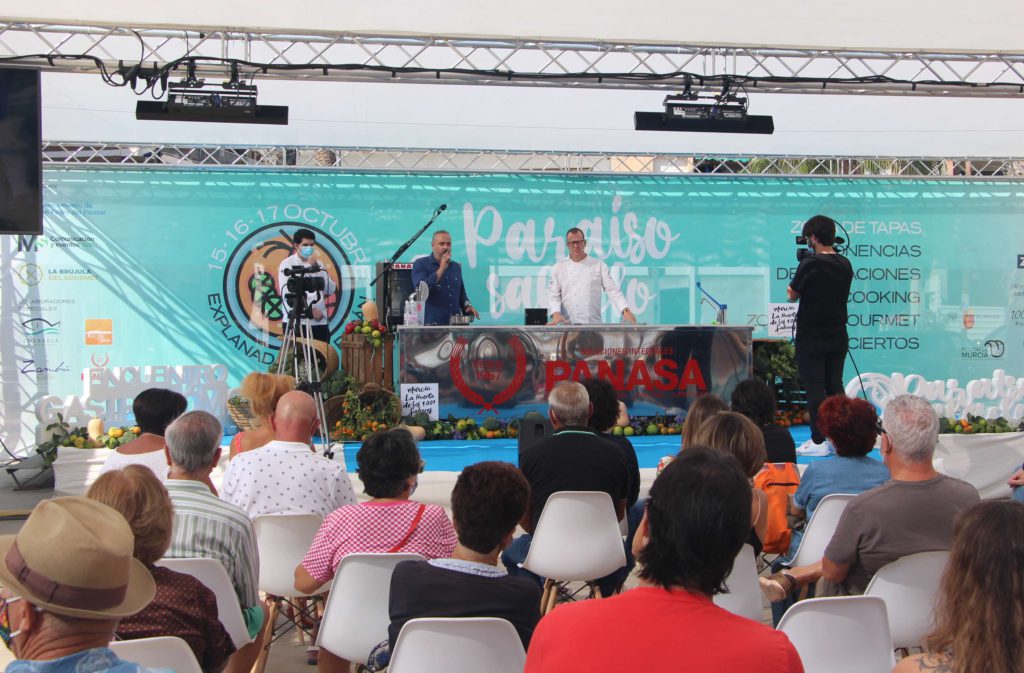 Además, más de un millar de asistentes disfrutaron de las ponencias de manera presencial de los mejores chef de la Región como María Gómez (Magoga), Pablo González, doble Estrella Michelin, que hizo las delicias de los asistentes con la ponencia ‘Un paseo gastronómico por la Región’, en el que recorrió diferentes puntos de la geografía regional; Sierra Espuña, el Noroeste, el Altiplano o la zona de costa, mostrando lo mejor de cada cocina, con platos y aperitivos con su toque personal, destacando el llamado, Mar Menor, Nazario Cano (Odiseo), David López (Local de Ensayo)Patricia Pérez (Panadería José Antonio), Pedro Sánchez (Restaurante Venezuela, Ruben Delgado y Alfonso García (Txio Restaurante), Manolo Castro y Juan Antonio Campoy (Cosafina), Javi Zapata (Carmen Playa) y los conocimientos sobre el producto local. Cofradía de Pescadores de San Pedro del Pinatar.